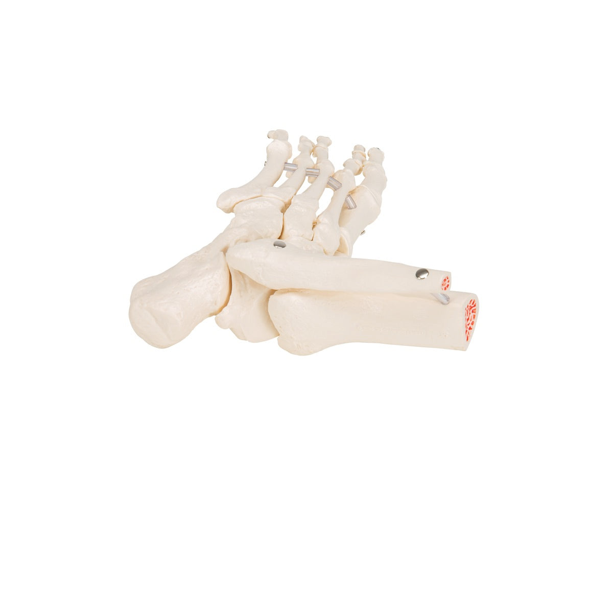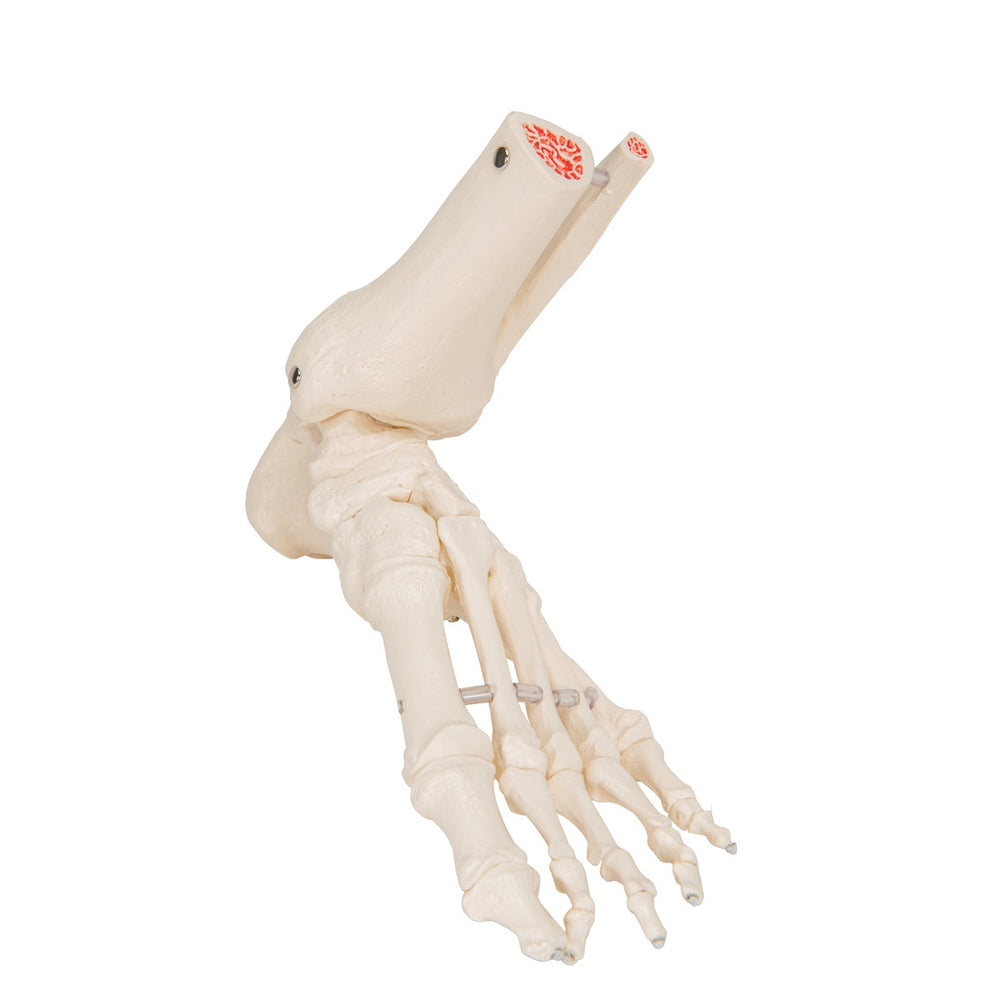This loose foot and ankle skeleton comes mounted with elastic bungy for a flexible effect. The foot skeleton includes portions of the tibia and fibula. Flexible throughout for a more realistic anatomy model of the human foot.