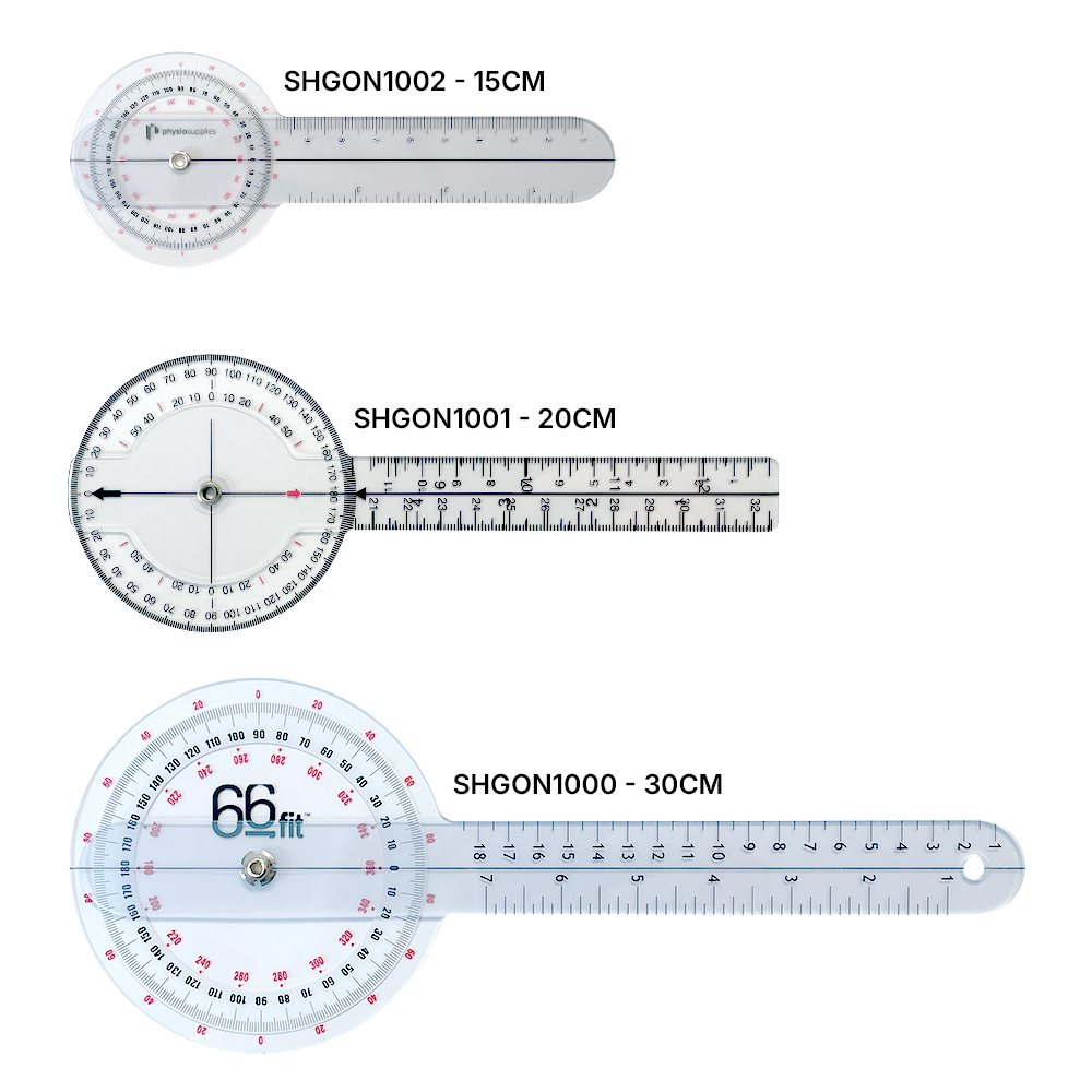 The plastic 360 degree scale ISOM goniometers have a head with three scales calibrated for use with the ISOM system. The clear plastic permits observation of the joint's axis of motion and range of motion.