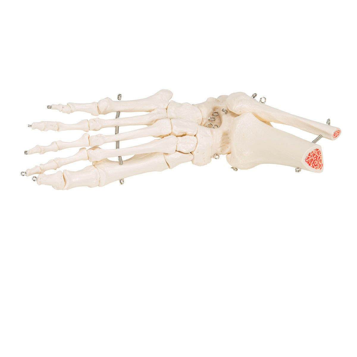 This foot and ankle skeleton is wire mounted for a flexible effect. The skeleton includes lower most portions of the tibia and fibula. The anatomy model is slightly flexible through the toes and the ankle is naturally flexible. The anatomy model of the human foot is high quality and realistic.