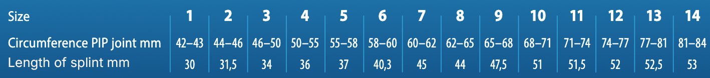 EXTO®-15 is available in sizes 1–14 with an asymmetrically graded length of each splint size. The measurement chart can be used as a guide to select the right size; however, an individual fitting is always recommended.